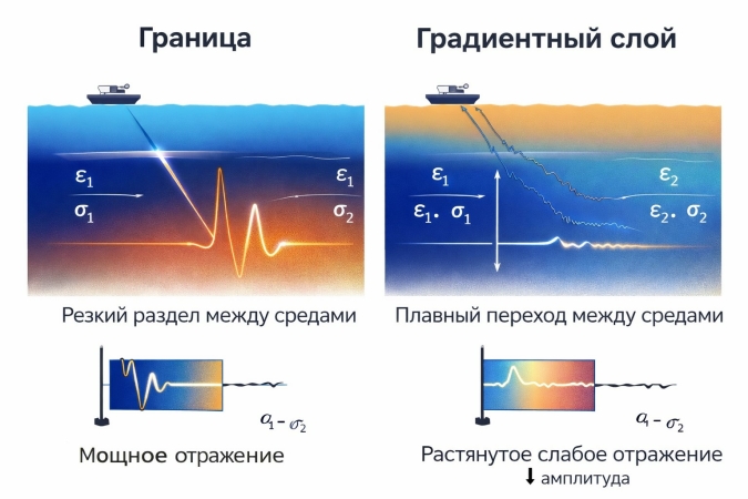 В работе подчёркивается принципиальная важность корректного разграничения понятий «граница» и «градиентный слой» при интерпретации георадиолокационных данных в проводящих средах. Показано, что вклад диэлектрической проницаемости и электропроводности в формирование отражений различен по временным интервалам записи, что необходимо учитывать при физической интерпретации сигналов. Полученные результаты расширяют возможности применения георадиолокации в гидрологии, гидрогеологии и исследованиях процессов смешения природных вод.