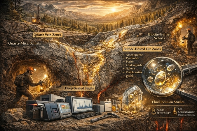 В докладе состав газовой фазы флюидных включений изучен методами рамановской спектроскопии и газовой хромато-масс-спектрометрии. Установлено существование флюидов с преобладанием CO₂ и метана, а также выявлены принципиальные различия между летучими компонентами, выделенными из кварца, сульфидов и самородного золота. Для золота характерно пониженное содержание воды и CO₂ при резком обогащении органическими соединениями.