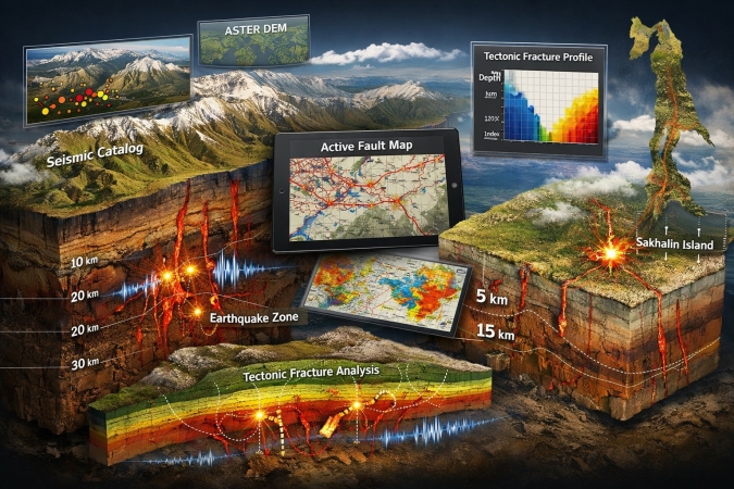 В качестве исходных данных использованы цифровые модели рельефа, сейсмические каталоги и базы данных активных разломов. Структурно-геоморфологический анализ позволяет выделять ослабленные зоны, интерпретируемые как потенциальные области локализации активных разрывных нарушений. Эти зоны далее используются в качестве входных параметров при расчёте коэффициента тектонической разробленности, основанного на плотности и протяжённости линеаментов в заданных объёмах.