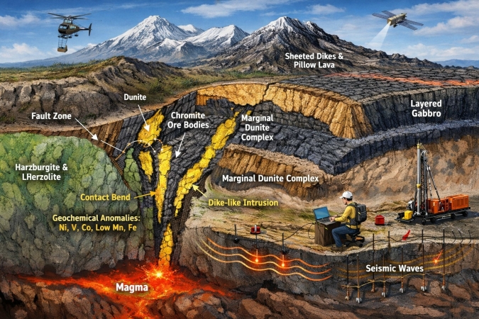 Проанализированы геохимические и петрофизические критерии поисков. Показано значение первичных геохимических аномалий по никелю, железу, марганцу, ванадию и кобальту, а также ограничения их использования при наложенном метаморфизме. Отмечена неоднозначность интерпретации магнитных аномалий в условиях серпентинизации и обоснована необходимость комплексного подхода при прогнозировании хромового оруденения.